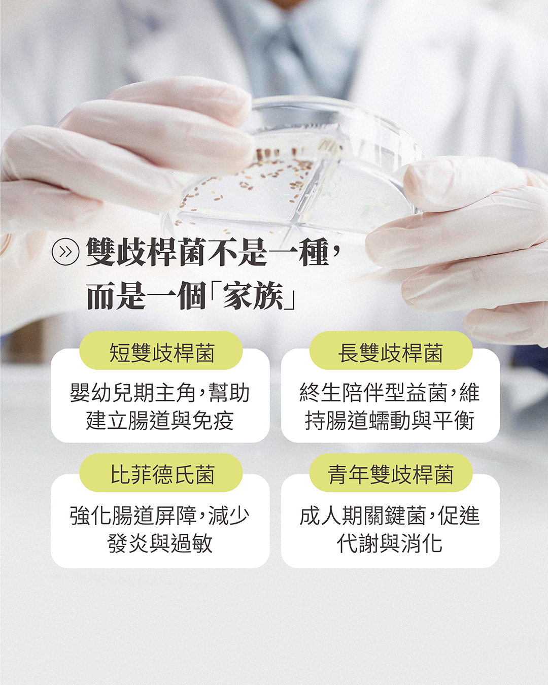 說到「雙歧桿菌」,很多人以為它只是益生菌的一種,但其實雙歧桿菌是一整個龐大的家族。不同菌株在人體不同階段各有任務:有的在嬰兒期幫助建立腸道菌叢,有的在成人期穩定消化功能,也有的在老年時維持免疫與代謝平衡。以下是幾種研究最深入、對人體健康最重要的代表菌株: