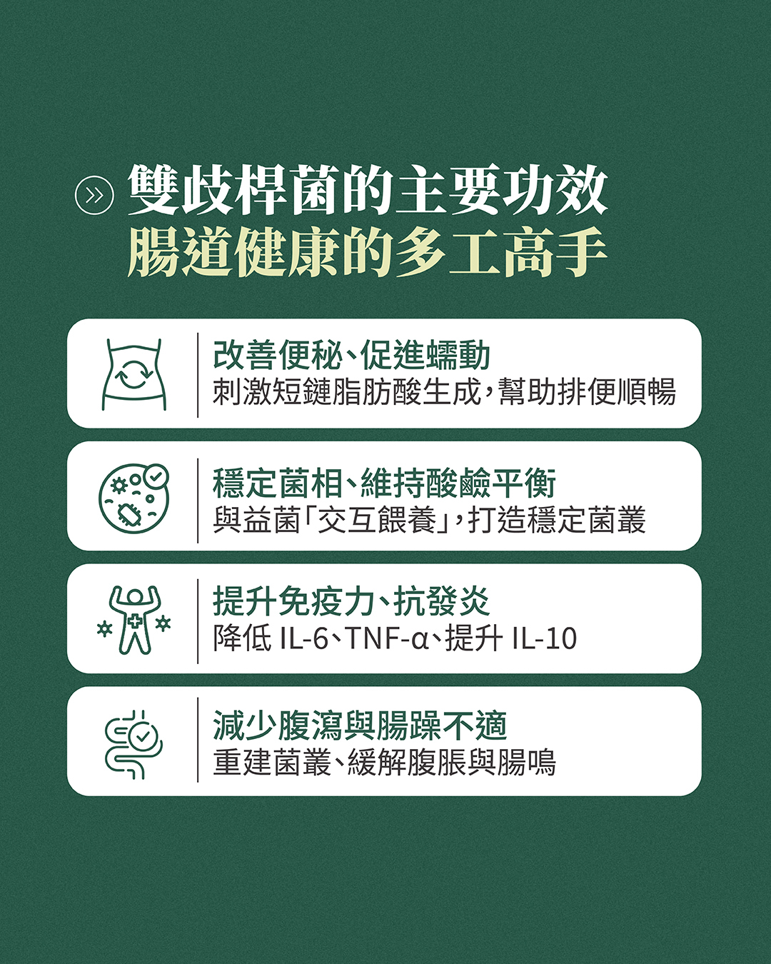 綜合來看,雙歧桿菌不僅能改善消化與排便,更透過免疫與菌相的雙重調控,全面維護腸道與全身的健康。