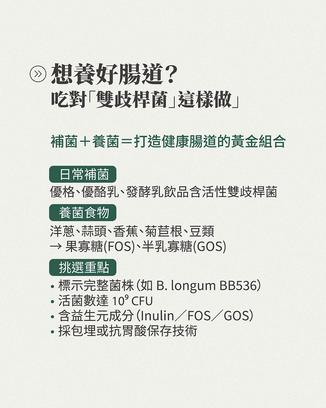 A:富含益生質(如洋蔥、蒜頭、香蕉、菊苣根、豆類)的食物能餵養雙歧桿菌,搭配優格或發酵乳效果更佳。