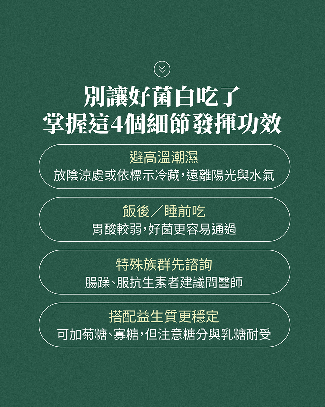 雙歧桿菌屬於對環境相當敏感的益生菌,若保存或食用方式不當,很容易導致活性下降、效果打折。想讓它在體內發揮最大功效,建議注意以下幾點: