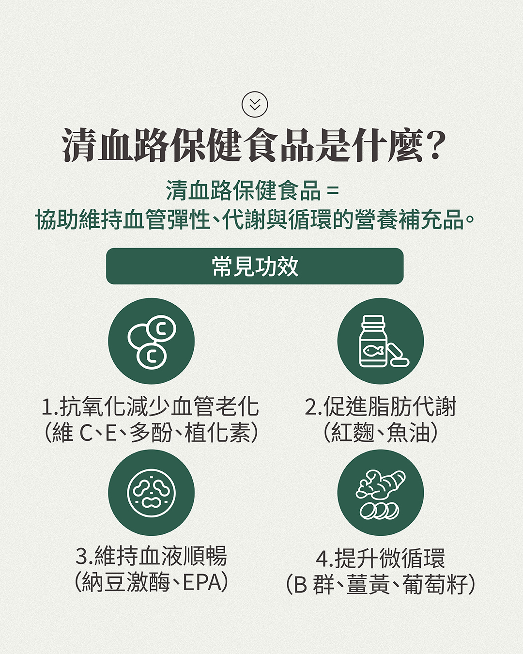 「清血路保健食品」或「清血路健康食品」通常指可幫助維持血管彈性、促進代謝、支持血液循環的營養補充品。常見訴求包含: