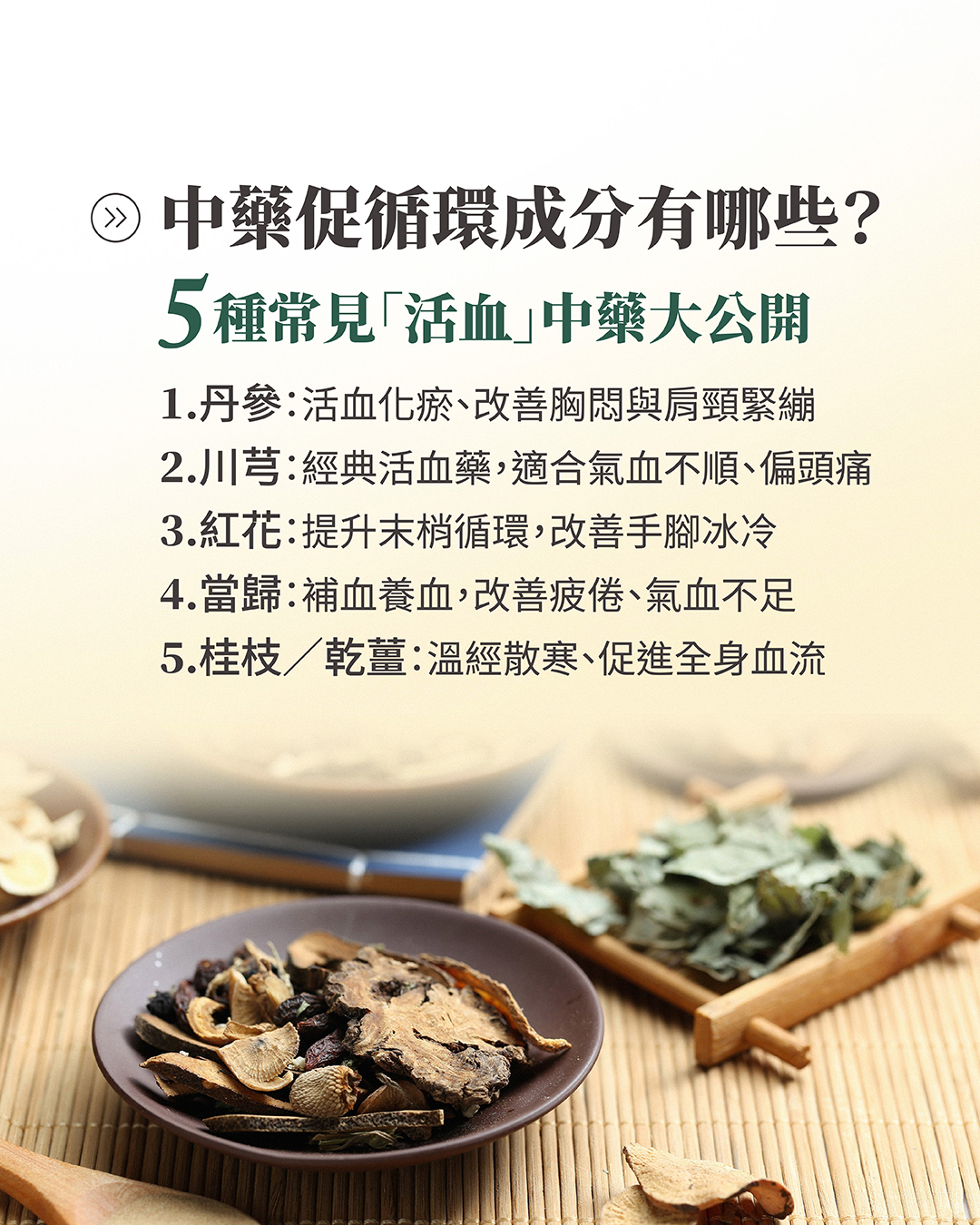 搜尋熱度超高的「清血管中藥方」並不是萬用配方,中醫會依據個人狀態(氣虛、血瘀、寒性體質)而調整處方。以下是常見具有活血與促進循環效果的中藥成分: