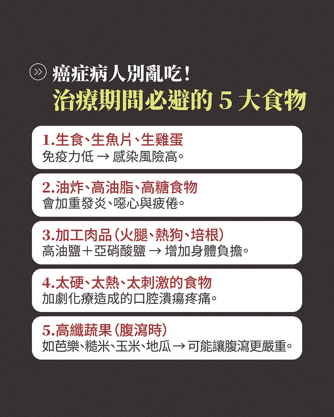 患者不是「永遠不能吃」,而是:治療期間要避免增加身體負擔。