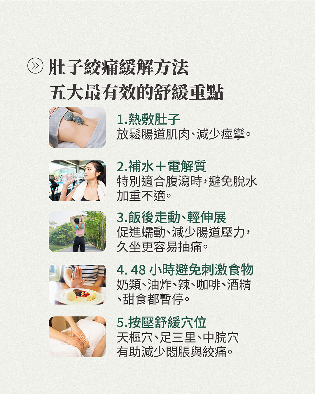 特別適用於「絞痛腹瀉」時,避免脫水讓腸道更不穩。