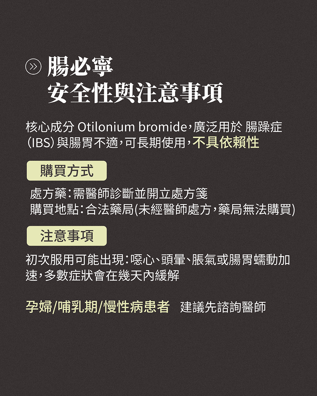 Catilon 腸必寧哪裡買?在台灣腸必寧仍屬於處方藥,需經醫師診斷並開立處方箋後,方可在各大藥局購買。因此,沒有經過醫師診斷,腸必寧藥局是買不到的喔!建議患者先至醫療院所諮詢醫師,取得處方箋後再前往藥局購買。