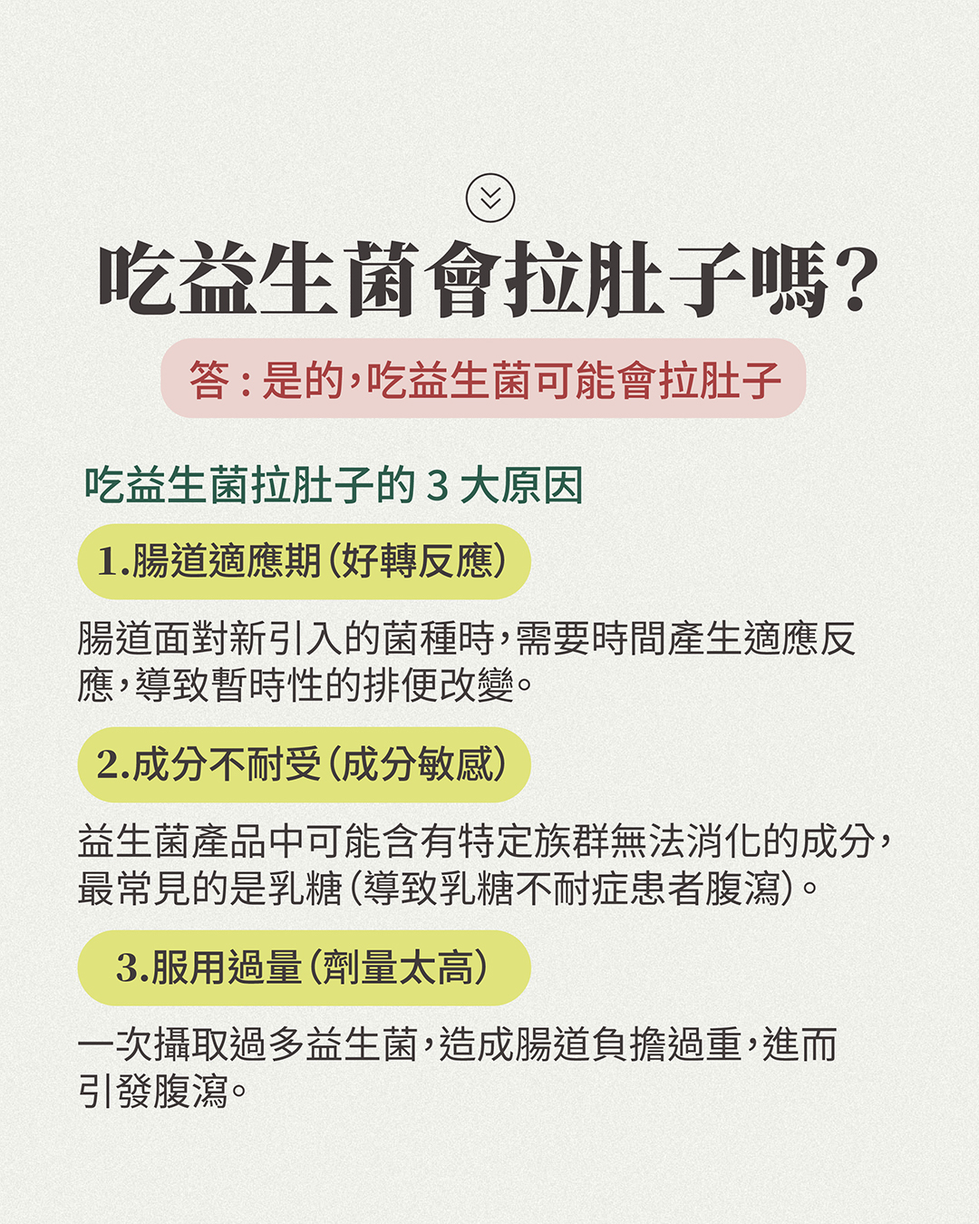 (3)此外過服用過量益生也可能導致腸道負擔過重,進而引發腹瀉。