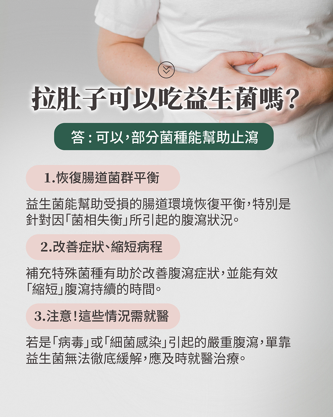 研究發現,部分特殊的菌種的確有助於恢復腸道菌群的平衡,並改善腹瀉症狀、縮短腹瀉持續時間。