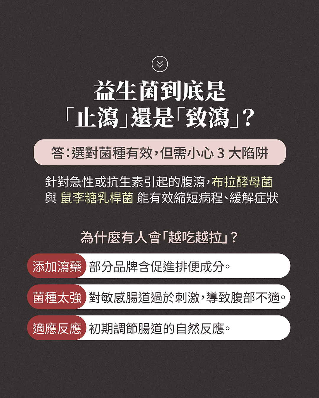 此外,針對「常拉肚子要吃什麼益生菌」的問題,專家建議要選擇產品有針對腹瀉做臨床實驗的益生菌配方,因為市面上很多的益生菌都是針對便祕設計的。
