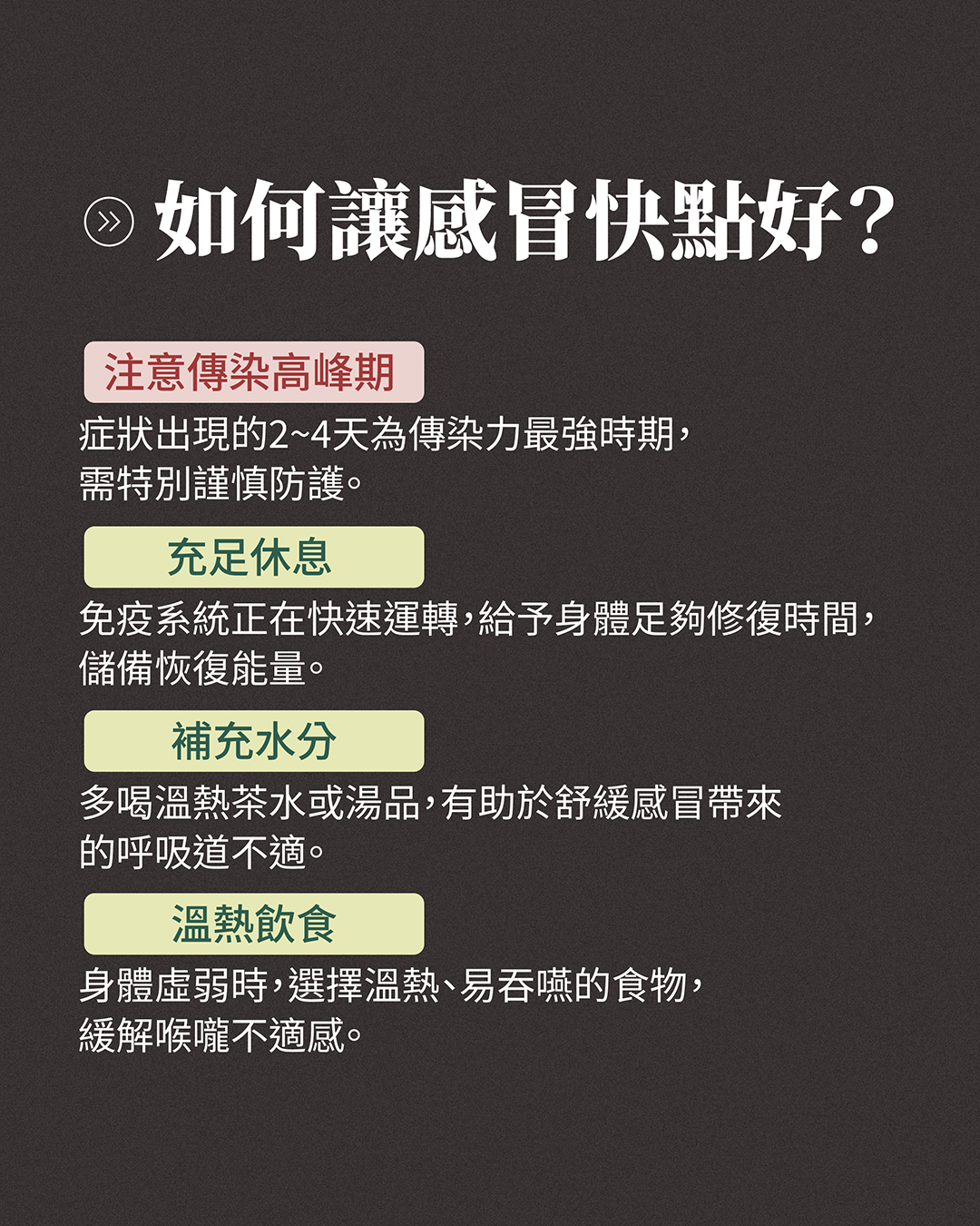 此時身體的免疫系統快速的運轉,應該給予身體足夠的時間休息,讓身體有能量恢復。