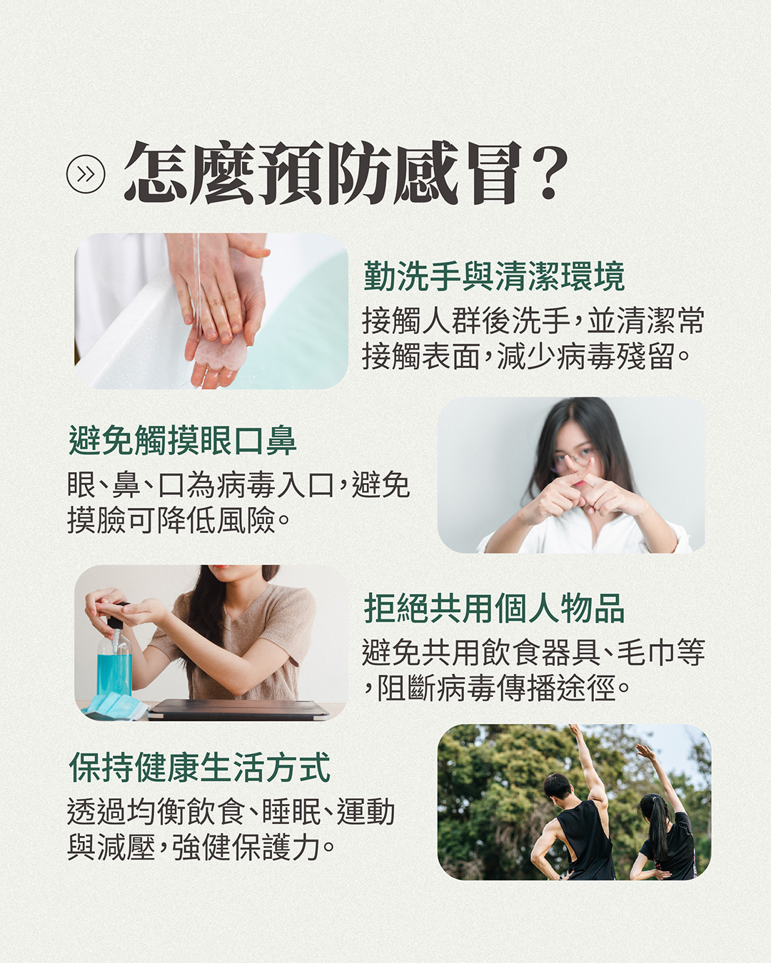包括均衡飲食、充足睡眠、適度運動和減壓。這都有助於強壯身心,減少感冒的機會喔!