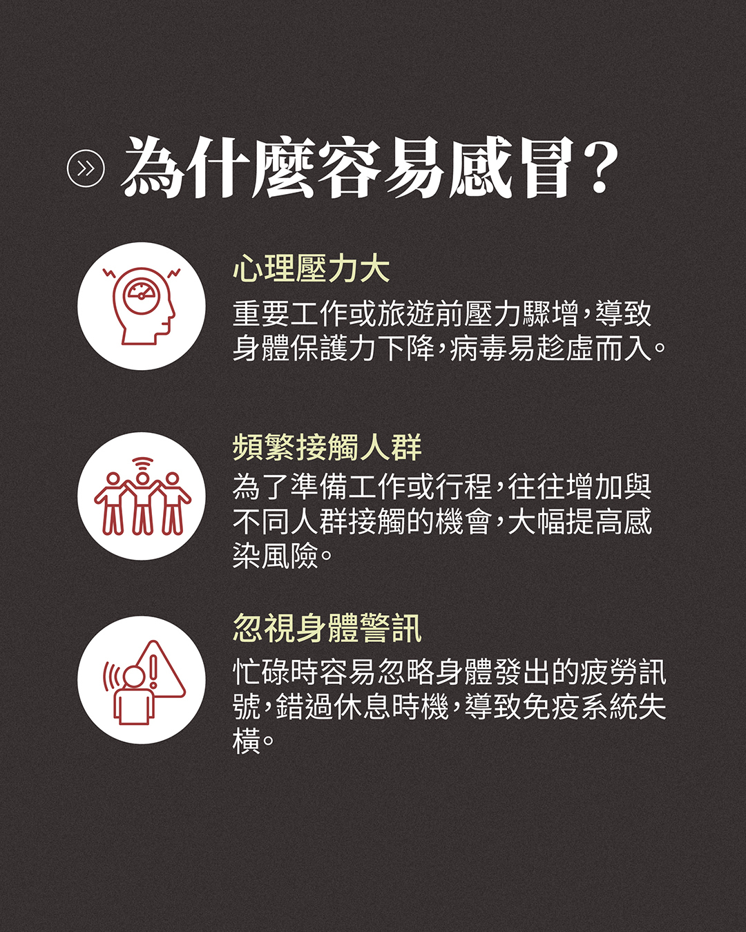 雖然以上預防方法可以降低感冒的風險,但無法完全消除感染的可能性唷!至於為什麼感冒總是發生在重要工作、出門工作前後呢?因為此時不僅壓力大,加上與大量不同的人群接觸,因此都增加了身體感冒的風險,所以平常我們還是要時時刻刻注意自己的健康狀態,不要輕視任何一個身體發出的警訊~