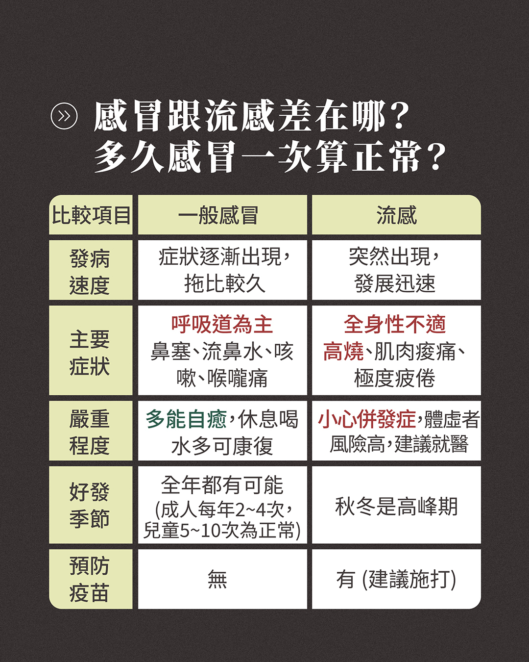 普遍來說感冒和流感症狀有很大一部分的重疊之處,以下我們來看看兩者的比較表格!