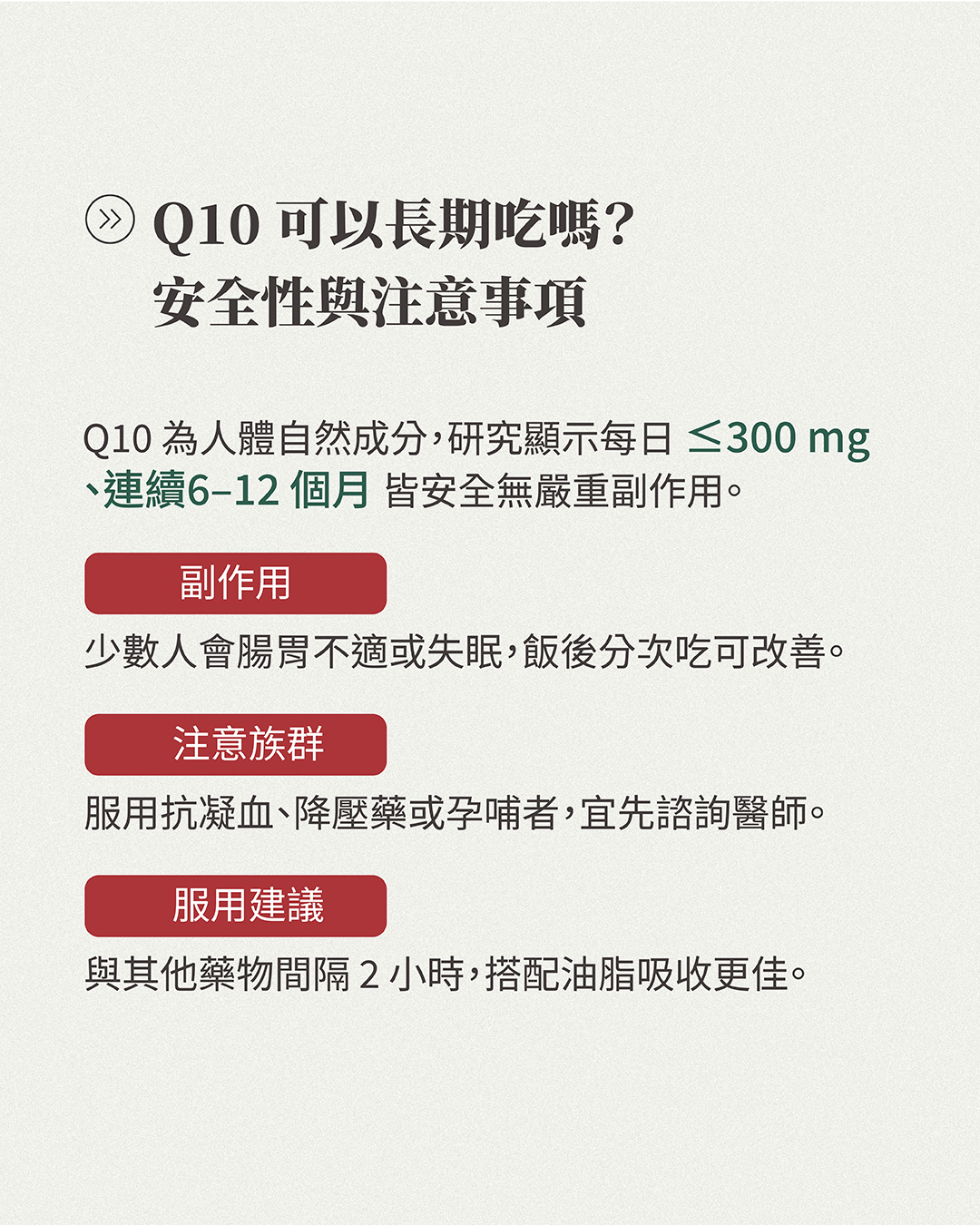 若同時服用降壓、降血糖或其他慢性病用藥,建議與 Q10 間隔至少兩小時服用,避免影響吸收與藥效。