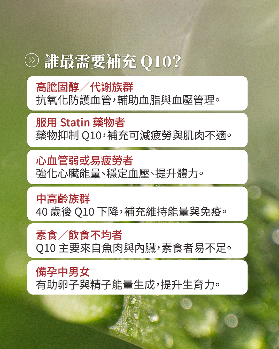 高膽固醇或 Statin 使用者:建議每日補充 100 mg 以上,穩定血脂與能量代謝。