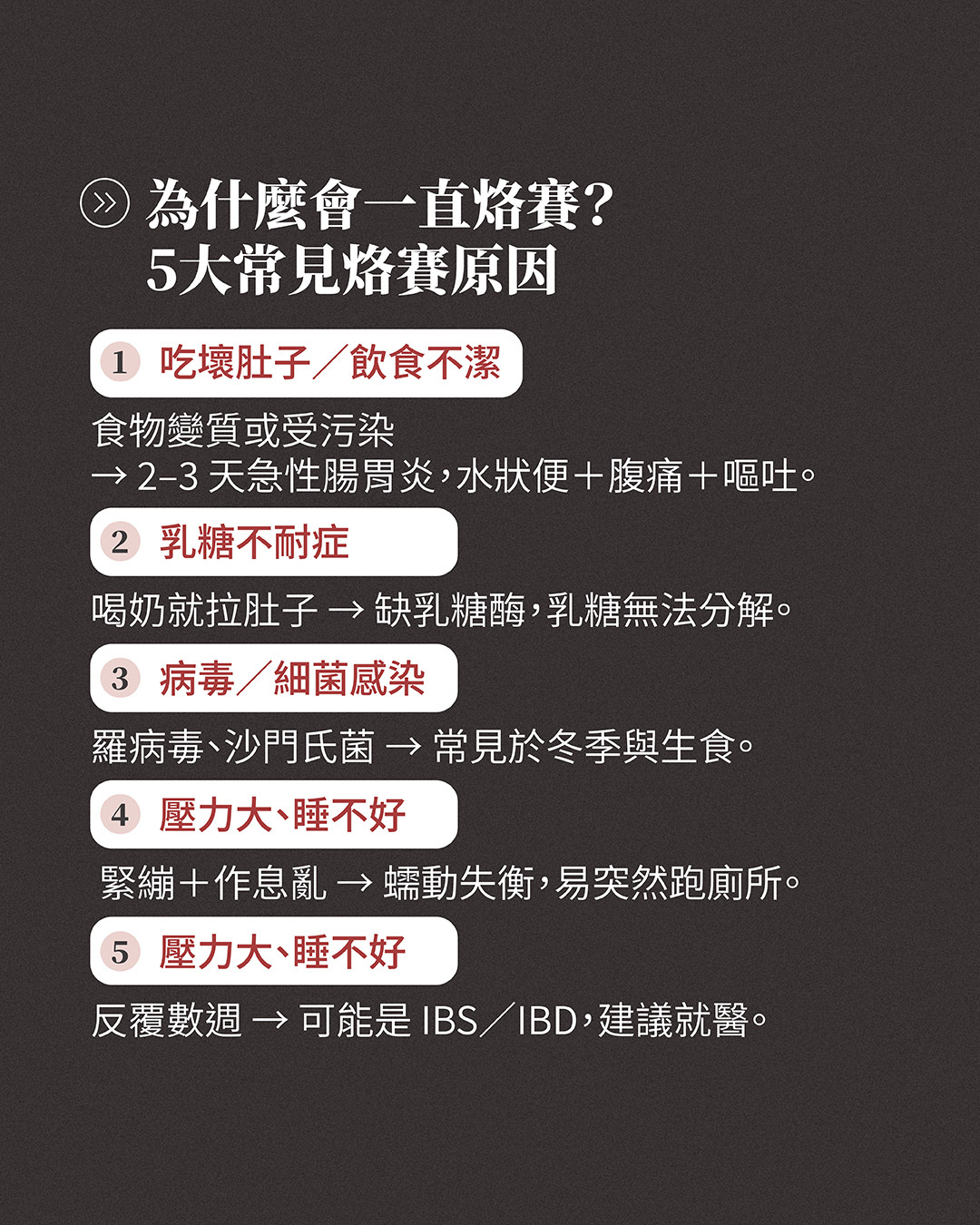 從吃壞肚子、乳糖不耐、病毒感染到壓力與慢性腸道疾病,一次搞懂反覆烙賽的五大關鍵成因。