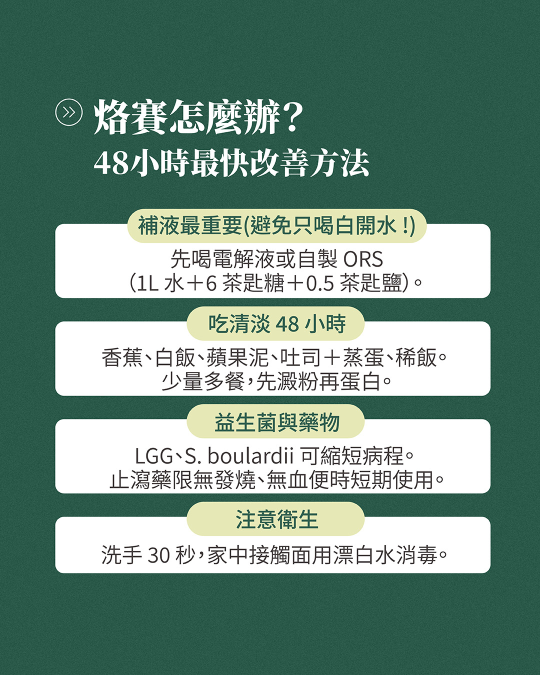 掌握短期急救重點:補電解質水分、選擇正確飲食、適量補充益生菌,快速舒緩不適。