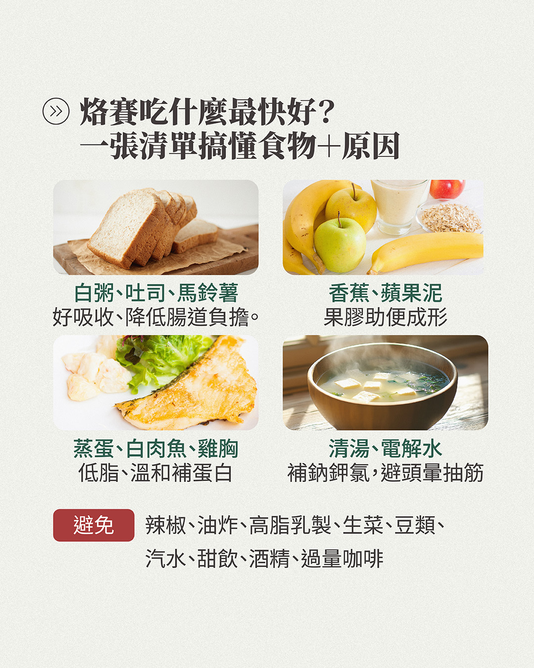列出烙賽時可吃與應避食物,包含白粥、香蕉、蘋果泥、蒸蛋與電解水等恢復首選。