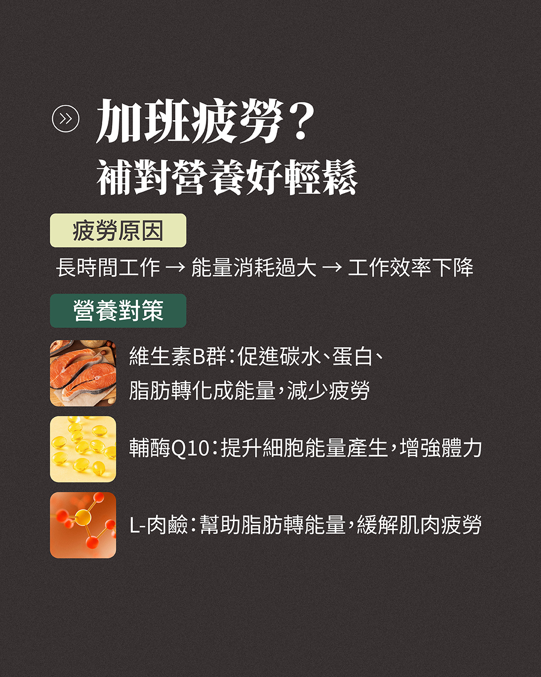 L-肉鹼:有助於脂肪轉化為能量,改善運動後或長時間工作導致的肌肉疲勞。