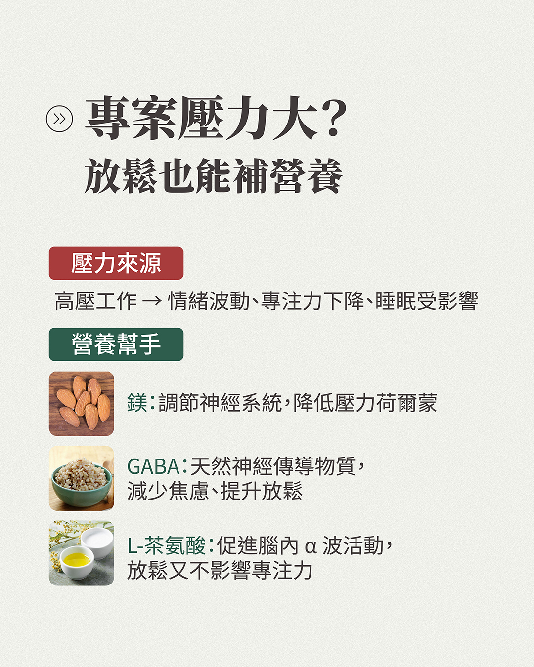 L-茶氨酸:能促進腦內α波活動,帶來放鬆效果,同時不降低專注力。