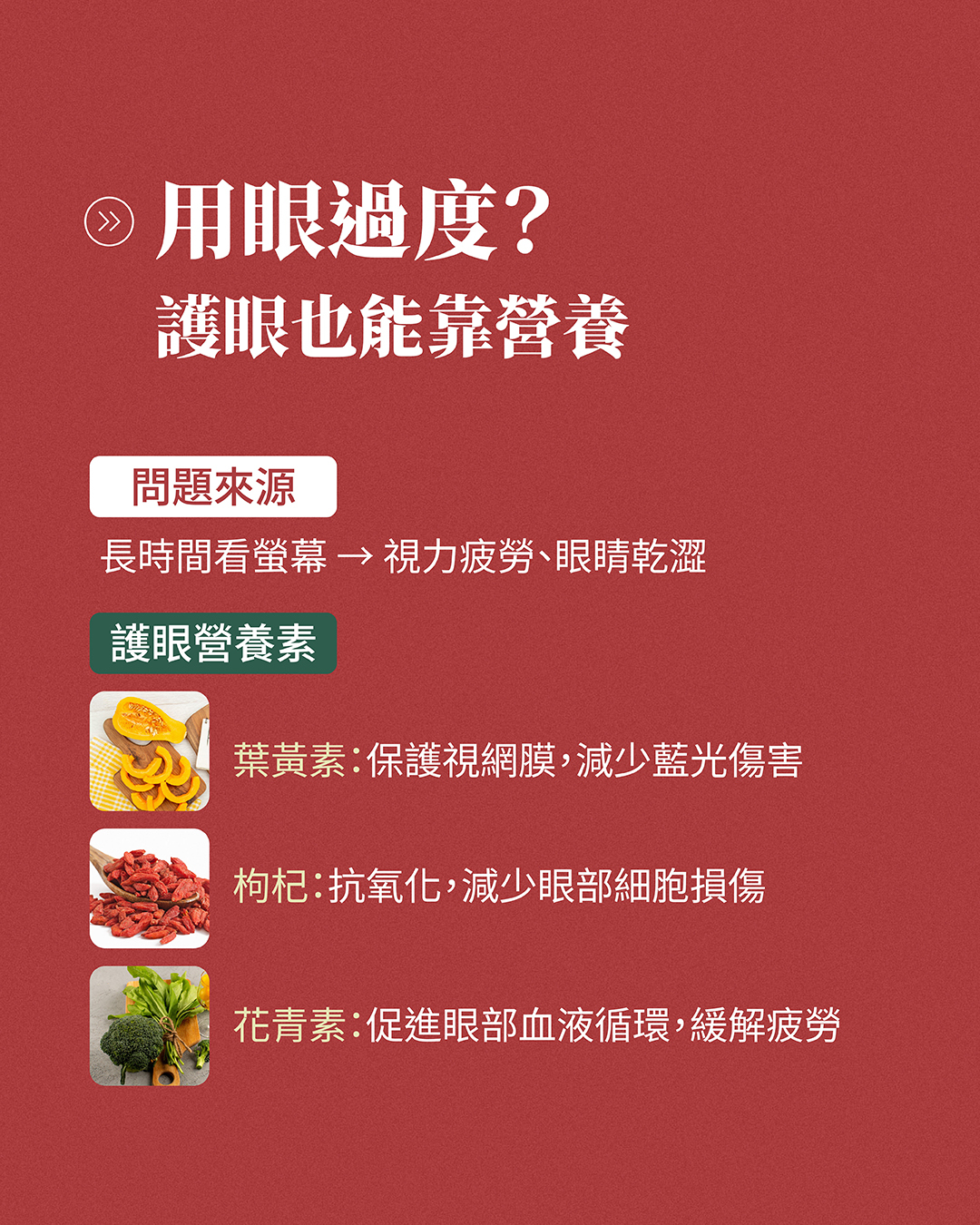 枸杞:含有豐富的抗氧化劑,能減少眼部細胞的氧化損傷,增強眼部健康。