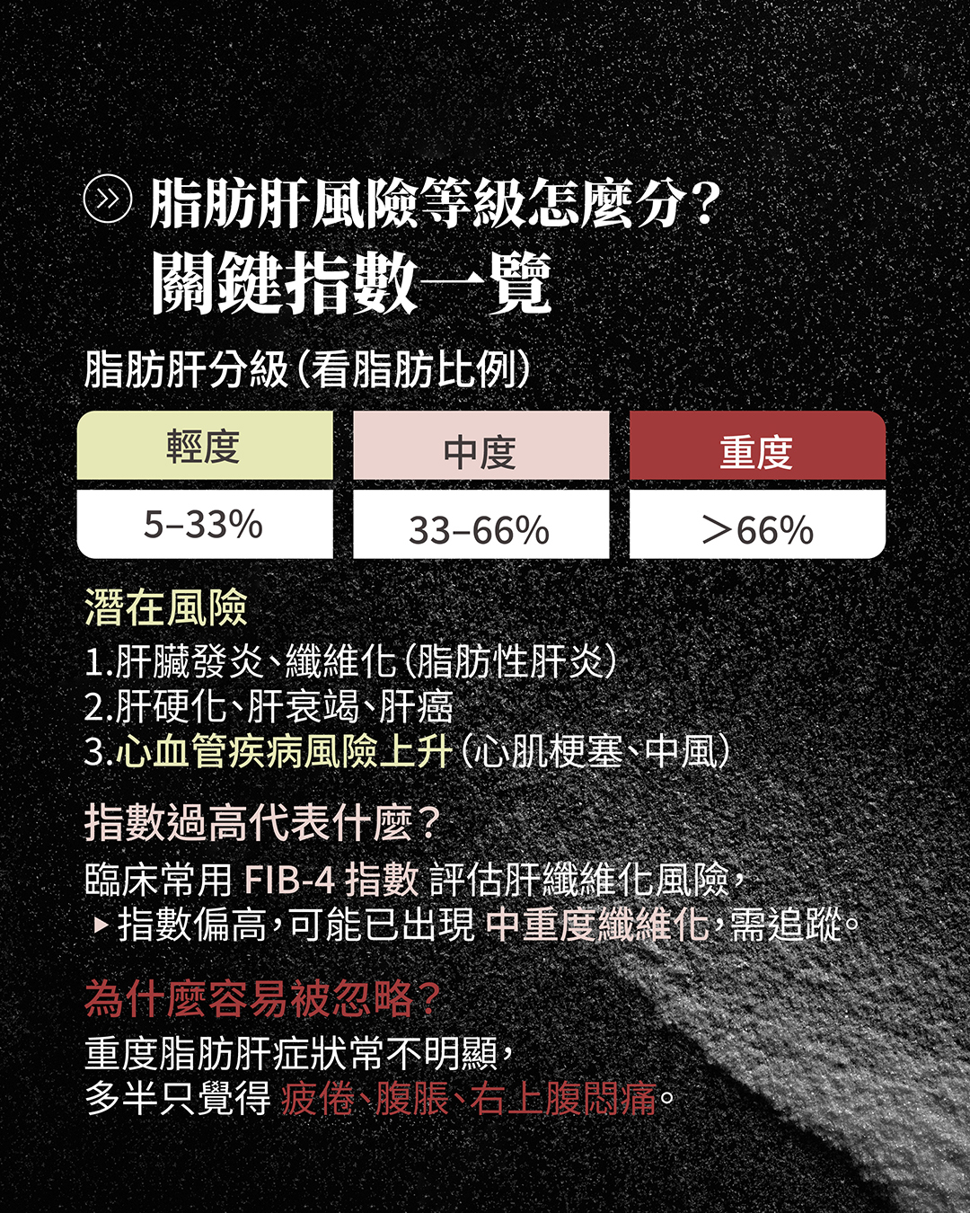 臨床上常使用 FIB-4 指數等非侵入性工具評估風險,若指數過高,可能代表已存在中重度纖維化,需要進一步追蹤。