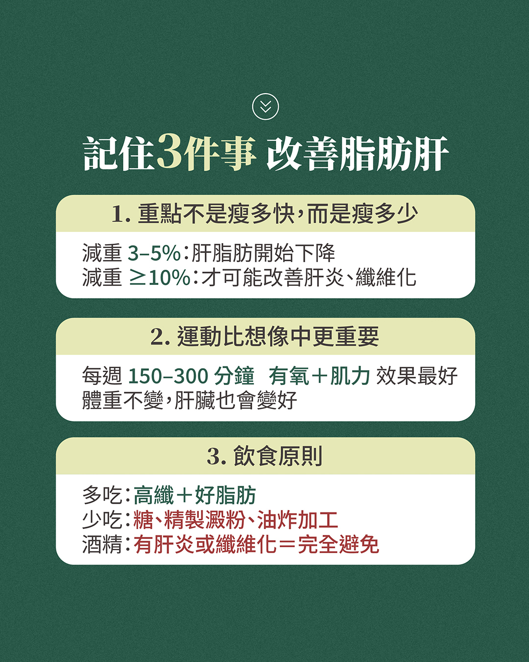 在飲食上,重點不在於完全禁食某一類食物,而是降低肝臟負擔、避免脂肪再次堆積。