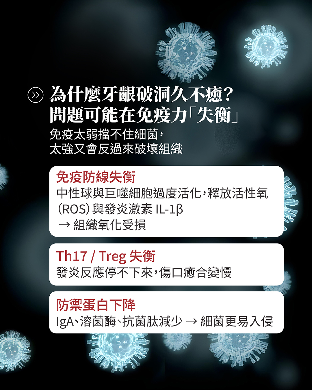 免疫系統中的 Th17 細胞主要負責發炎反應,而 Treg 細胞則負責抑制過度的免疫攻擊。當兩者比例失衡時,發炎持續不退、組織再生被延緩,牙齦破皮或潰瘍就難以癒合。這也是為什麼免疫力低下的人,即使牙齦破洞不大,也常拖很久才修復。