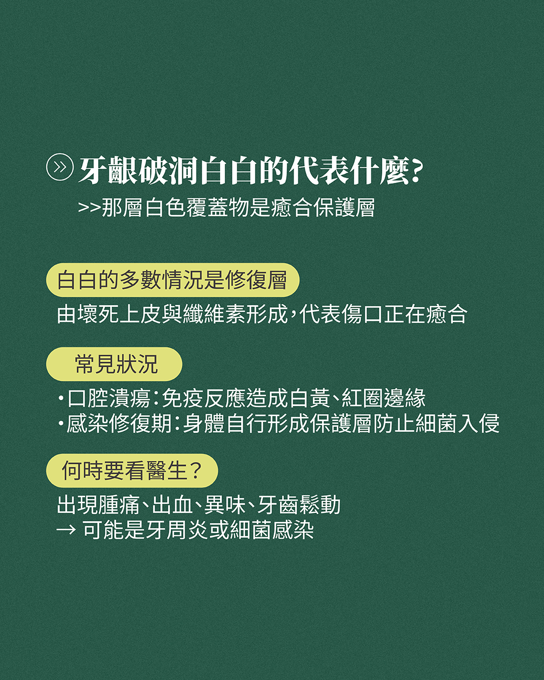 很多人發現牙齦或口腔破洞後,照鏡子看到那一圈「白白的」區域,最先關心的就是:「牙齦破洞會痛嗎?」並且直覺會聯想到膿或感染。但其實,大多數情況下那並不是膿,而是牙齦黏膜受損後形成的修復層。這層白色或灰白色的物質是由壞死的上皮細胞與纖維素覆蓋構成,代表組織正在進入癒合階段。