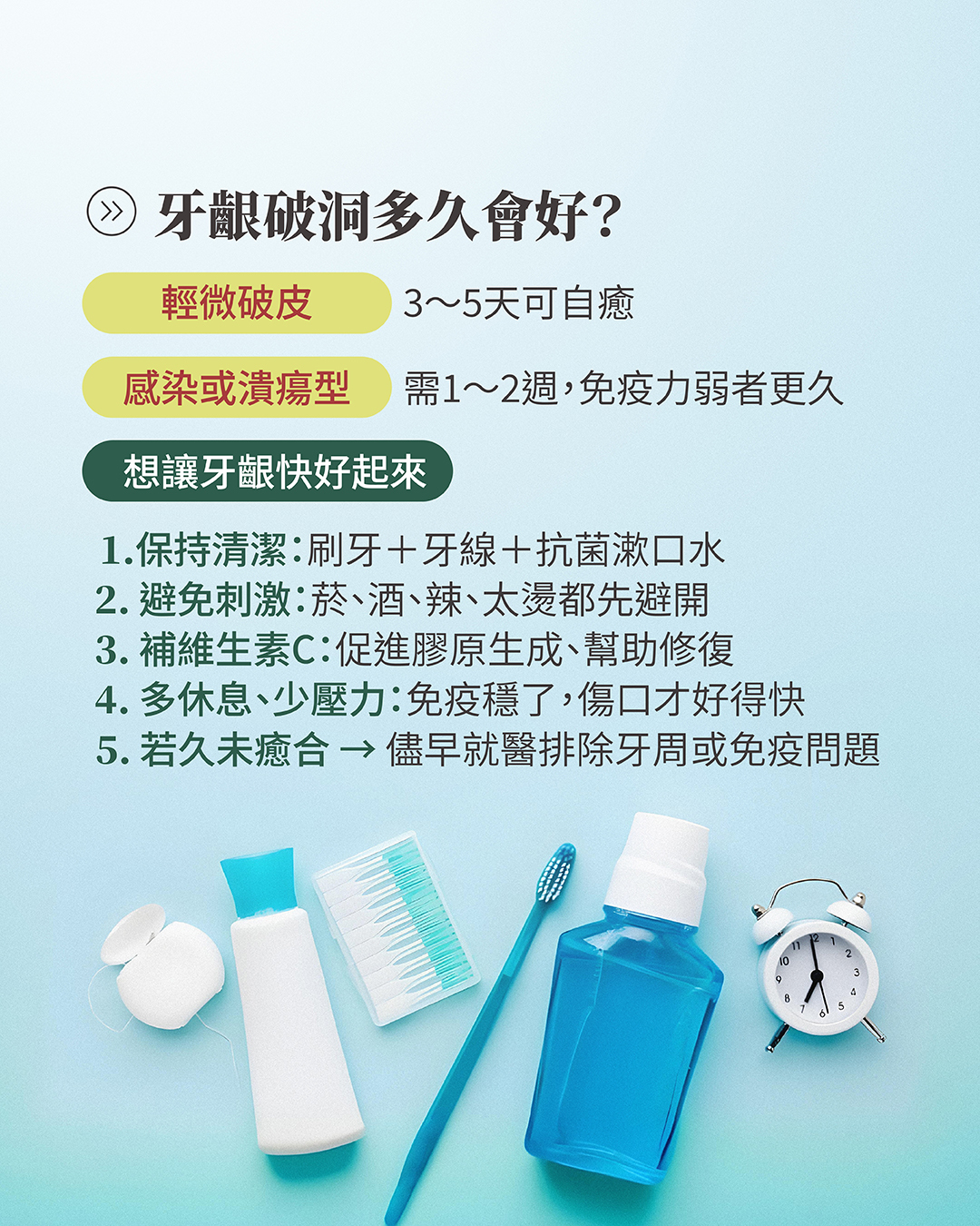 牙齦破洞的修復速度,反映的不只是局部狀況,更與整體免疫平衡與生活習慣有關。只要維持清潔、補充營養、讓身體有足夠休息時間,牙齦通常能在短時間內恢復健康。