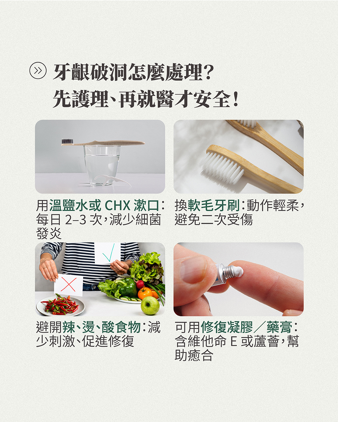 平時可使用溫和的抗菌漱口水(如氯己定 CHX)、或含維他命 E 的牙齦修復藥膏來輔助修復。但若破洞超過一週仍未改善,就不應自行處理,以免延誤治療時機。
