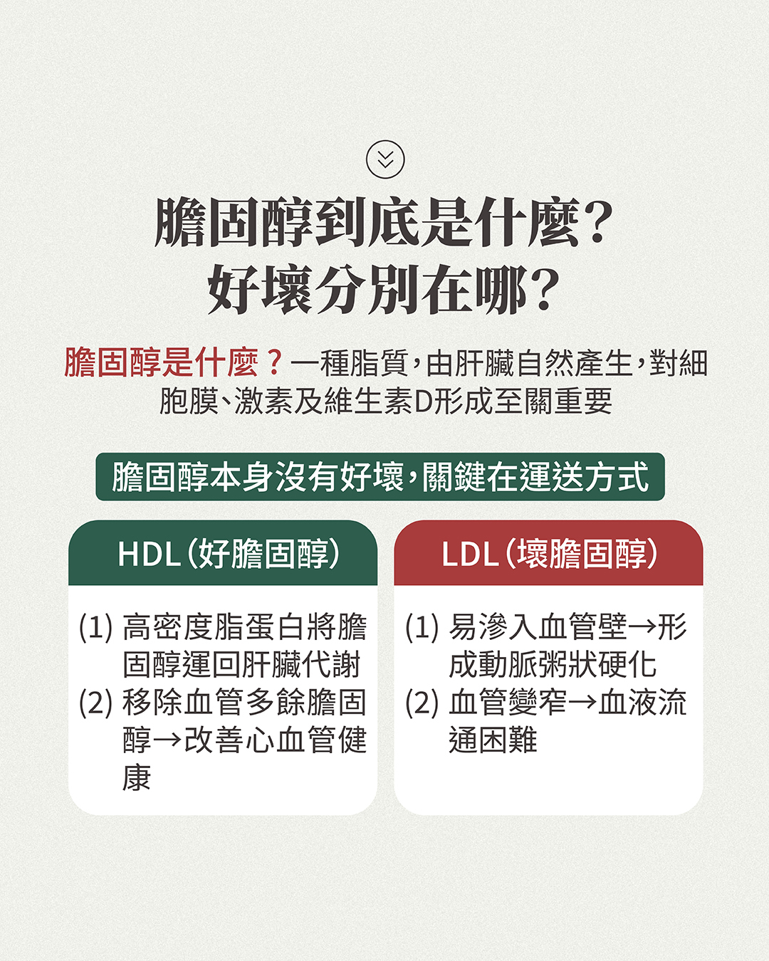 膽固醇「本身」並沒有分好壞,關鍵在於人體如何利用。因為膽固醇不溶於水,因此無法單獨在血液中運行,而膽固醇在血管內由脂蛋白負責運送及回收,最常見的兩種脂蛋白就是高密度脂蛋白 (HDL) 與低密度脂蛋白 (LDL) 。
