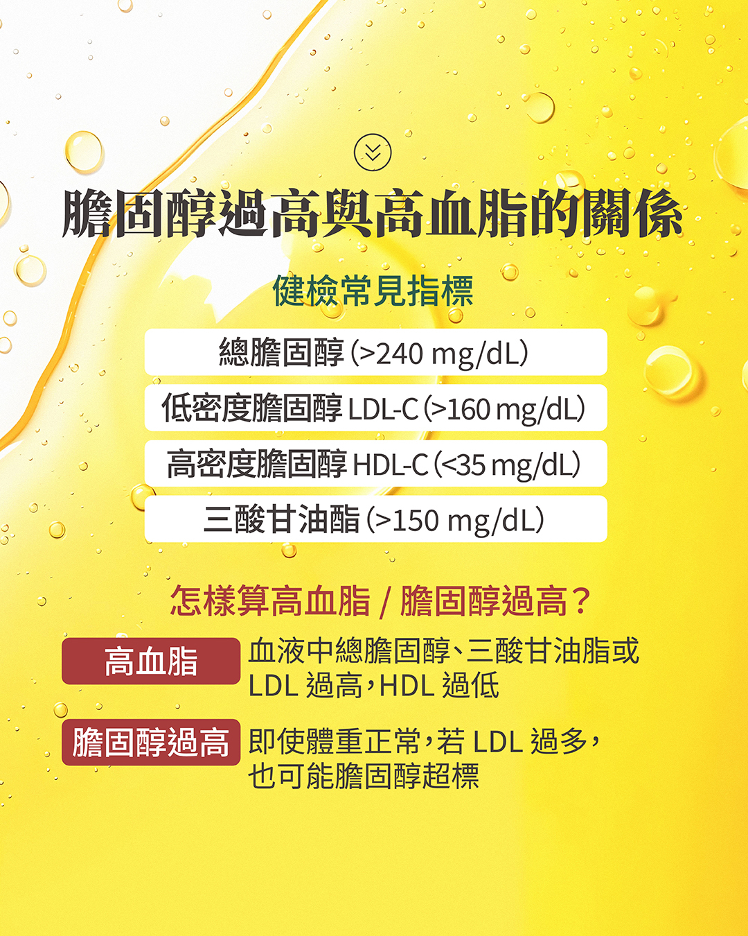 如果您的血液中總膽固醇(超過240mg/dl)、三酸甘油脂(超過150mg/dL)、低密度膽固醇(LDL-C)(超過160mg/dl)過高,而高密度膽固醇(HDL-C)(小於35mg/dl)過低,那就可能被診斷為「高血脂」。但如果血液中含有過多的LDL,就算你不胖,就可能被診斷為膽固醇過高或者膽固醇超標。