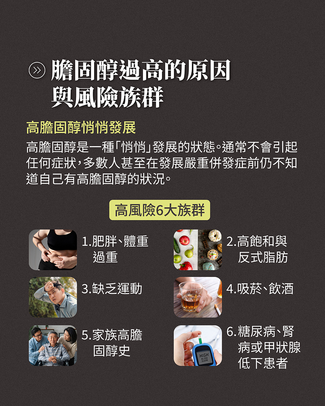 在大多數情況下,高膽固醇是一種「悄悄」發展的狀態。通常不會引起任何症狀,多數人甚至在發展嚴重併發症(如心臟病發作或中風)之前都沒有意識到自己有高膽固醇,我們下面也列出了高風險族群,就讓我們來一探究竟!