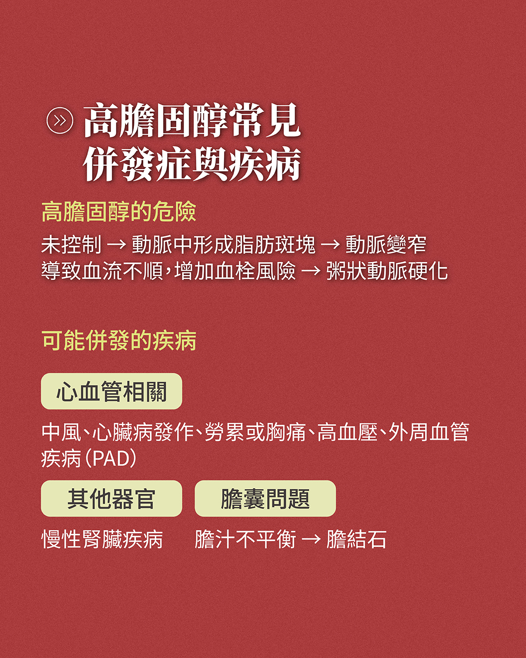 另外高膽固醇也會使膽汁不平衡,增加患膽結石的風險。以上這些嚴重的併發疾病就是為什麼我們應該要定期進行膽固醇檢測喔!!