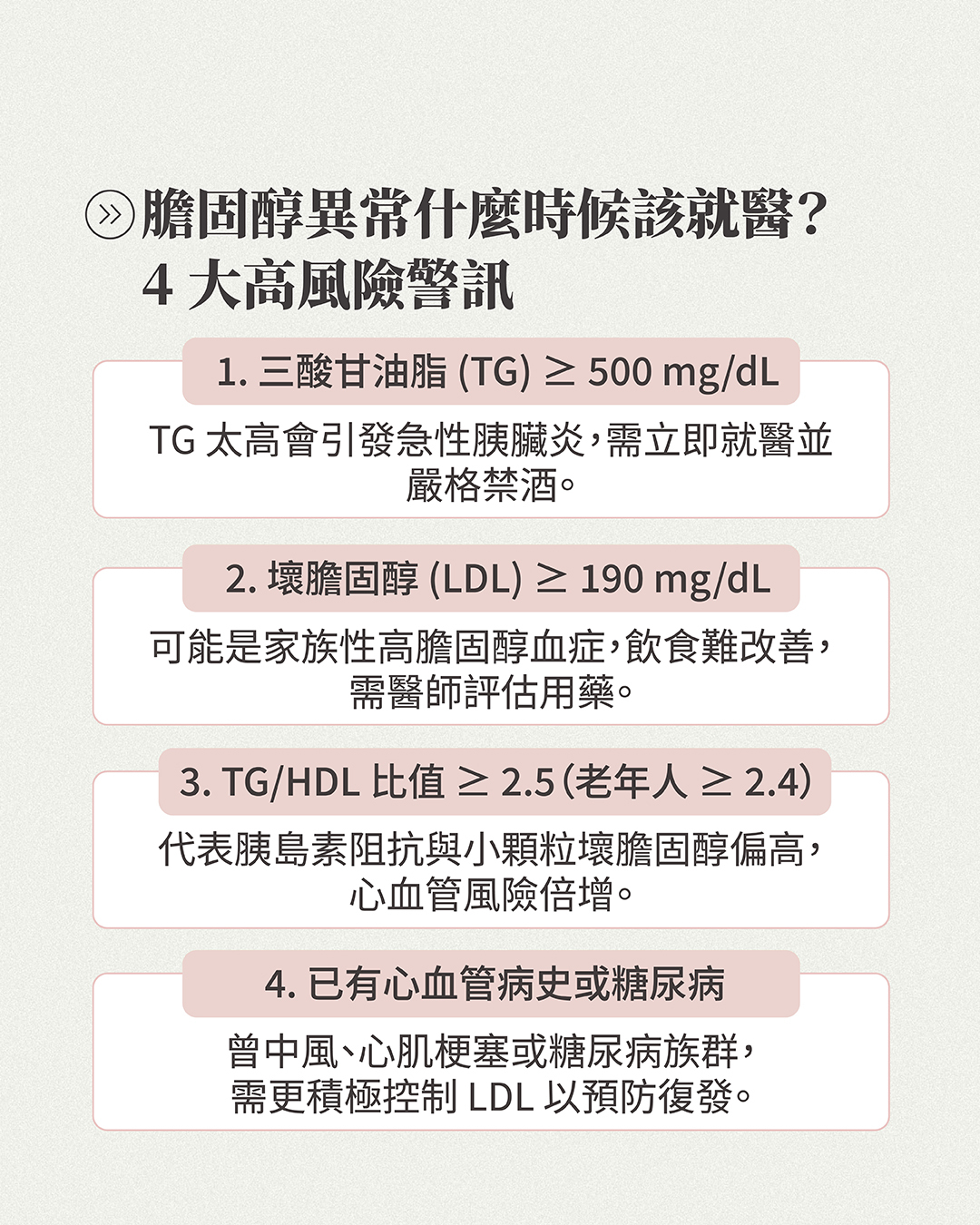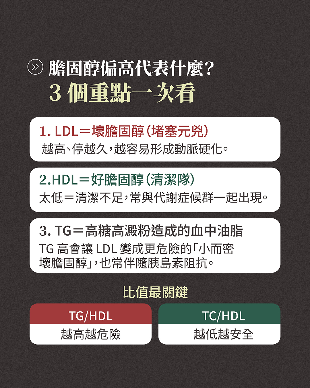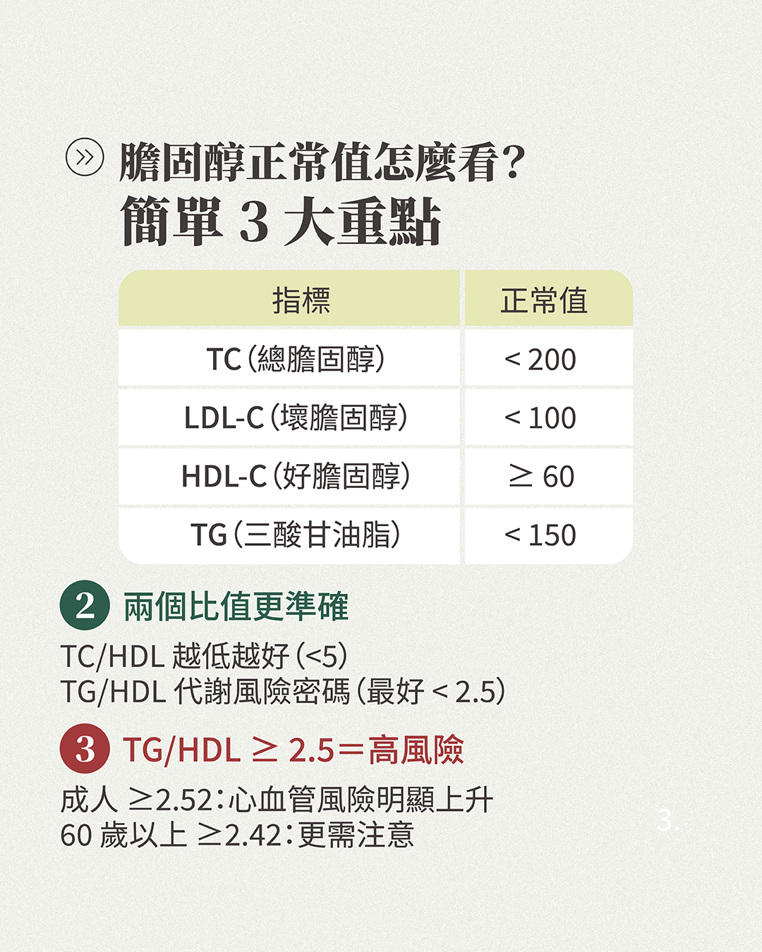 如前文說明,TG/HDL 比值是更敏感的風險指標。如果你算出來數值 ≥ 2.52(老年人 ≥ 2.42),代表你體內可能充滿了具破壞力的「小顆粒壞膽固醇」以及胰島素阻抗 。