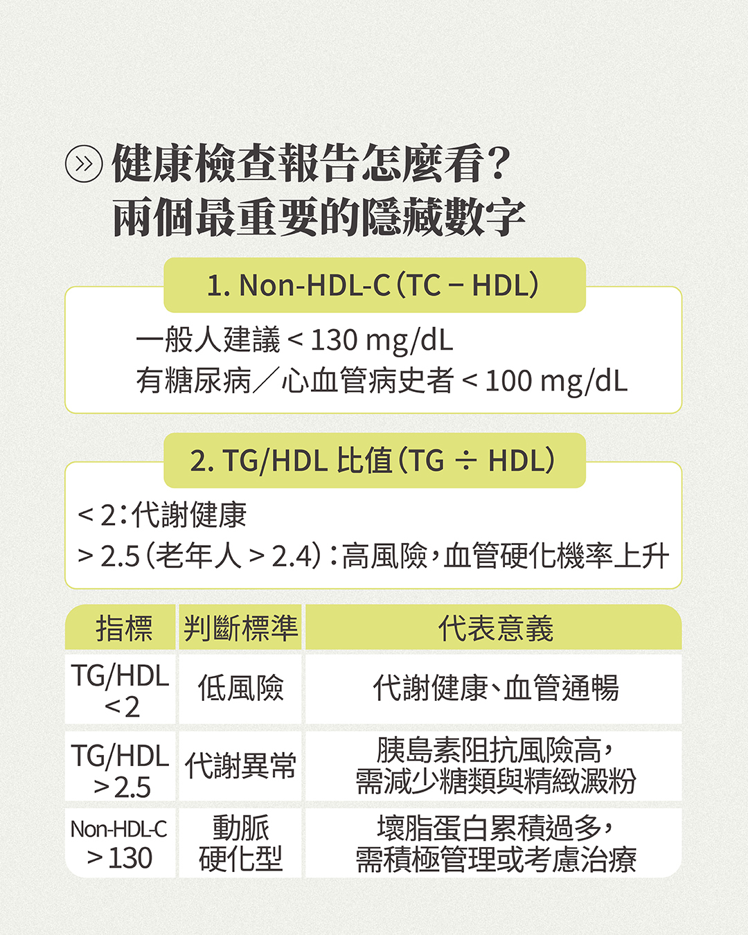 TG/HDL 比值:預測你是否有「胰島素阻抗」以及「小顆粒壞膽固醇」的強力指標 。比值越高,代表你的代謝狀況越混亂,未來發生心血管事件的機率也越高。