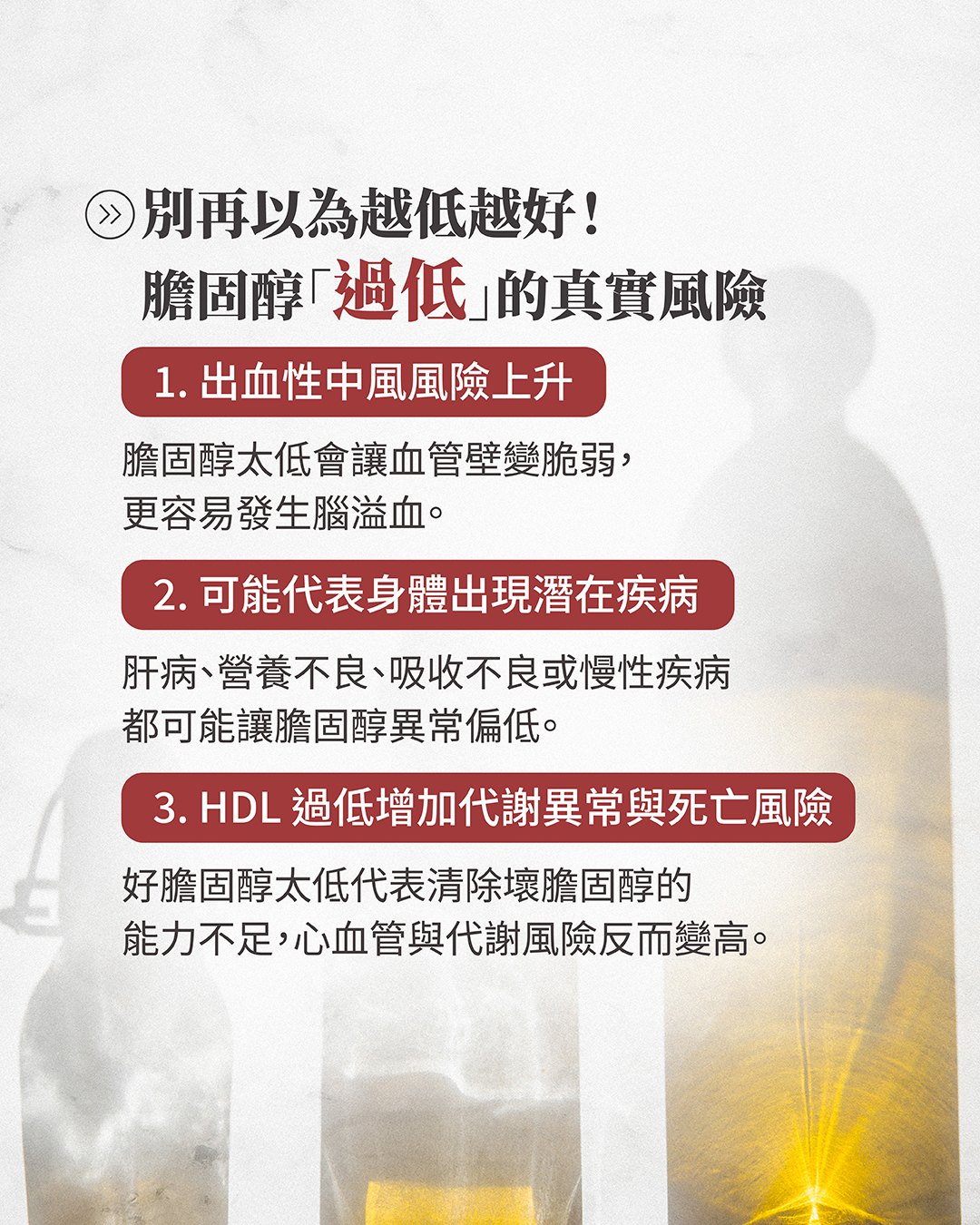 膽固醇是血管壁的建築材料。研究指出,過低的總膽固醇可能與出血性中風(腦溢血)以及呼吸道疾病的風險增加有關 。這就像房子牆壁太薄,雖然不會阻塞,但卻容易破裂。