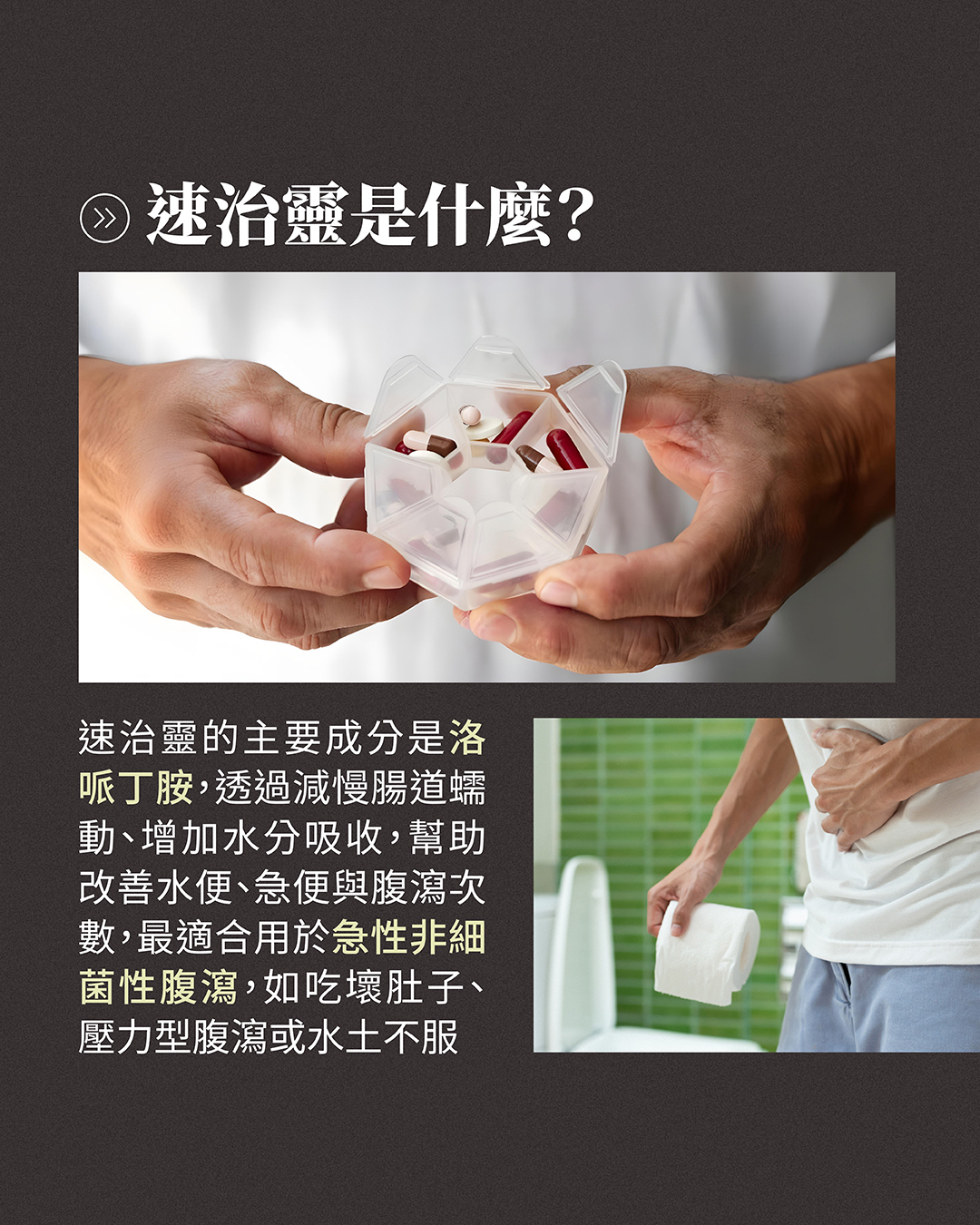 速治靈(Imodium)則比較像是「症狀控制幫手」,在排除感染性腸胃炎與高風險族群後,短期使用可以減少跑廁所的困擾,提升生活與工作便利性。