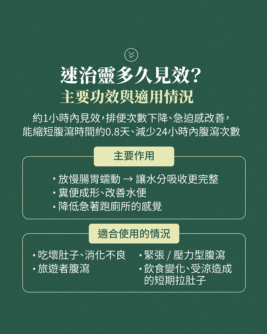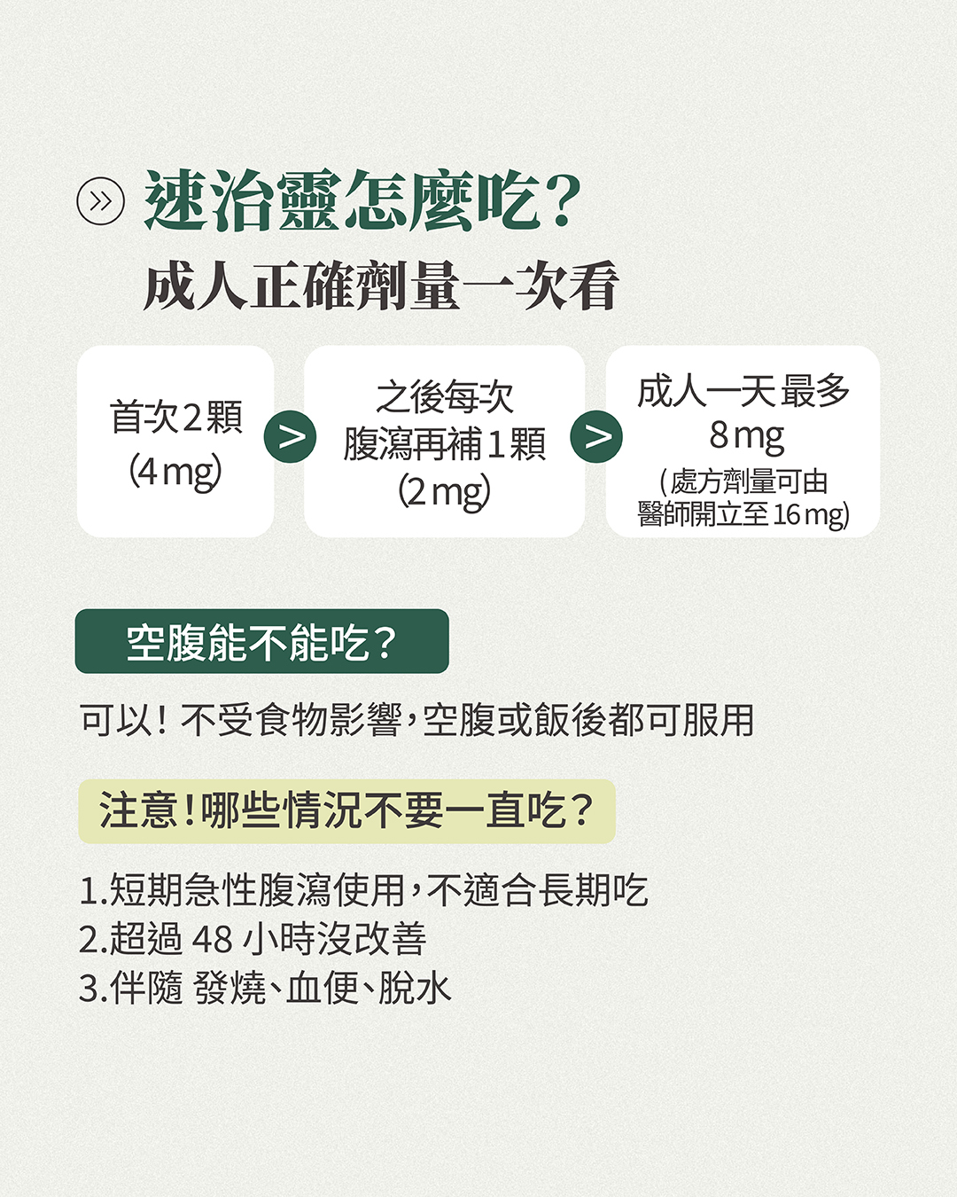 需注意的是,速治靈是用於短期急性腹瀉的臨時控制,不適合長期吃。若需要連續使用兩天以上,或停止用藥後仍反覆腹瀉,可能代表腹瀉原因不單純。