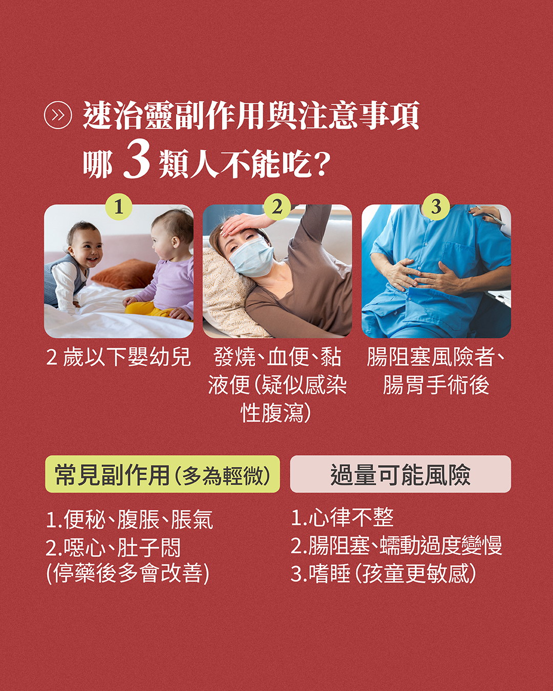 可能出現便秘、腹脹、腸道蠕動過度降低,極罕見情況會影響心律。若吃超過速治靈劑量建議並出現不適,應立即就醫。