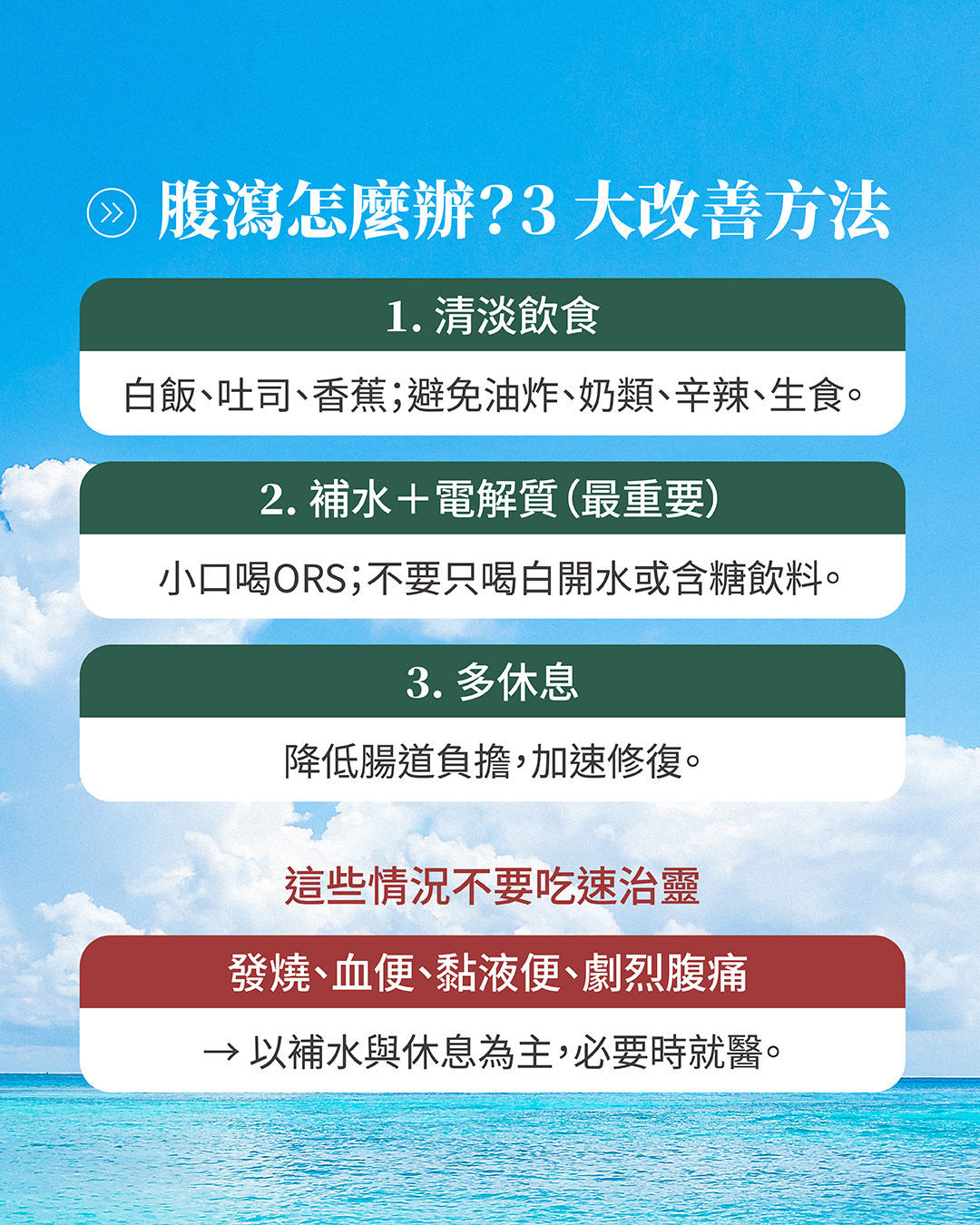 速治靈可以在短時間內減少腹瀉次數,但想讓腸胃真正恢復,還需要從飲食、休息和補水著手。以下整理出腹瀉期間最有效、最安全的日常調整方式,能與速治靈一起搭配,也能在不適合使用速治靈時提供替代方案。