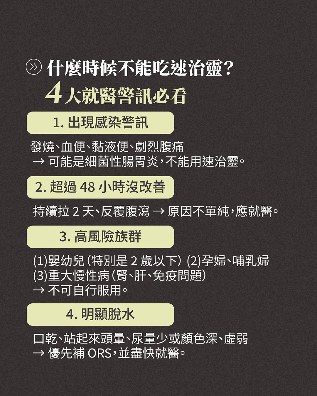 此時應以補充 ORS(電解質溶液)與就醫為主,而不是持續使用速治靈。