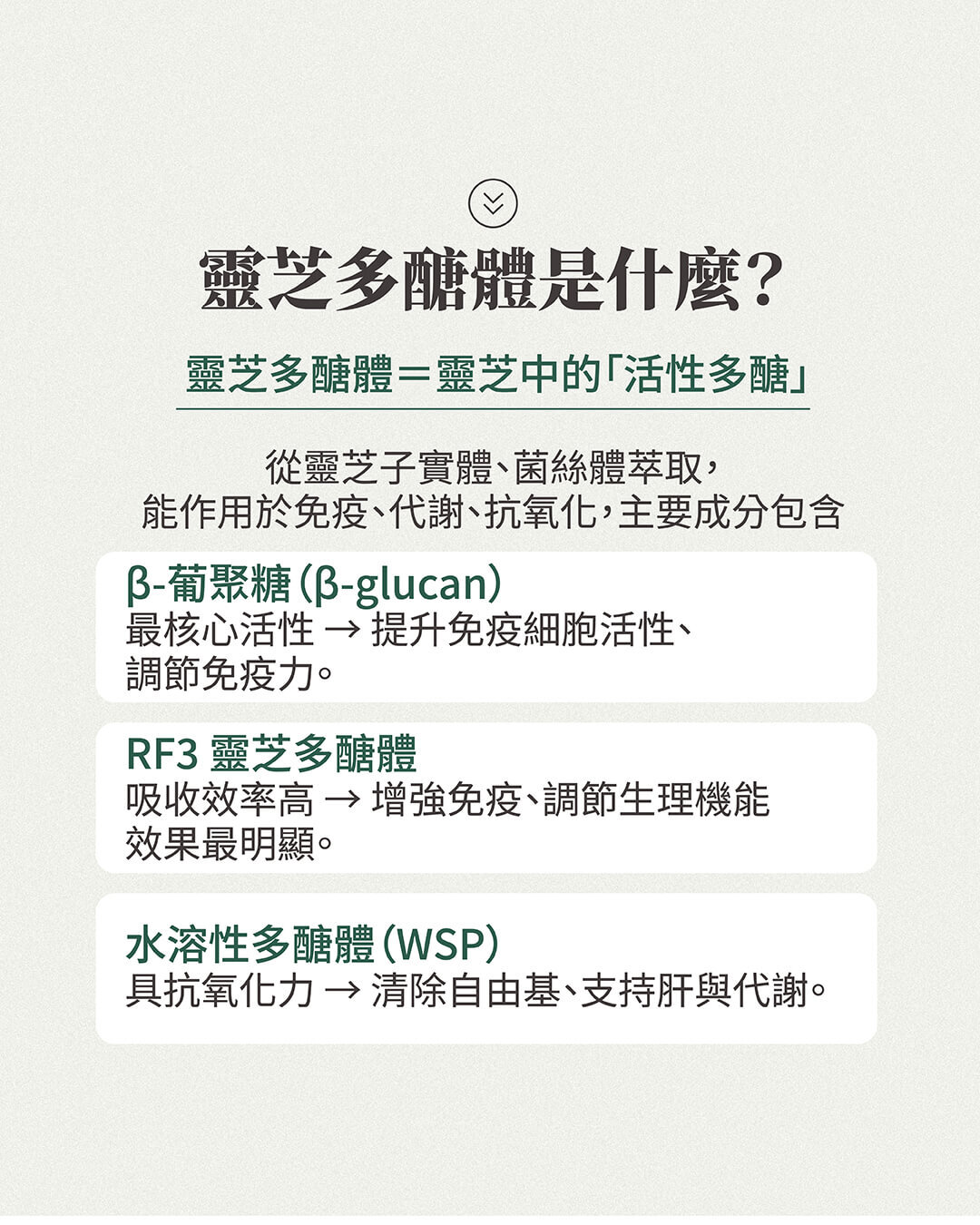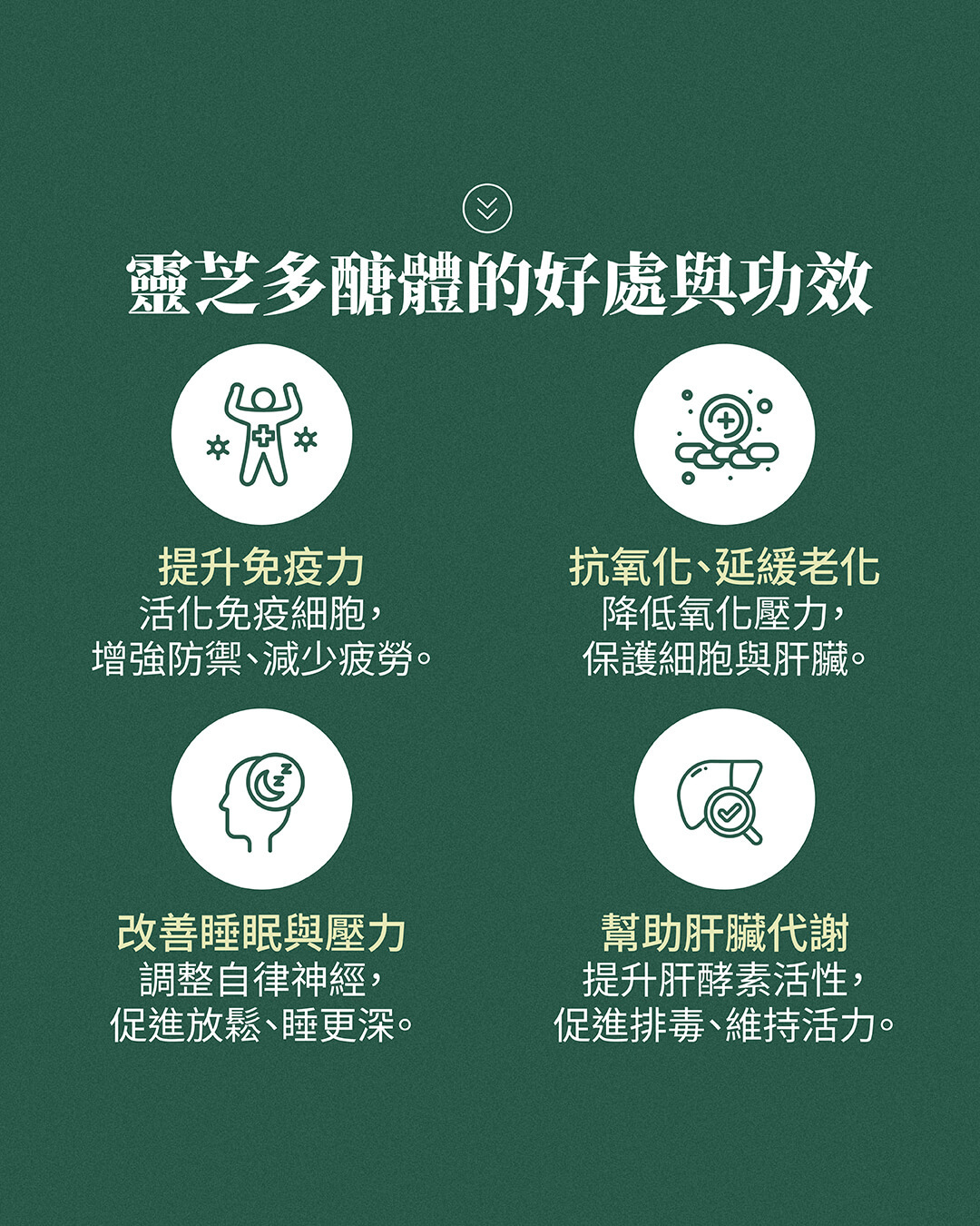 靈芝多醣體是靈芝的重要活性成分,與免疫調節、抗氧化、增強體力、代謝運作及肝臟保護等功能都有相關研究。