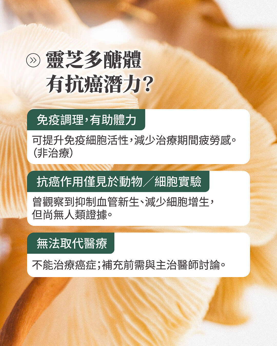 「靈芝多醣體在癌症領域的價值在於「調整體質、增進免疫功能 」,不是直接治療腫瘤。」