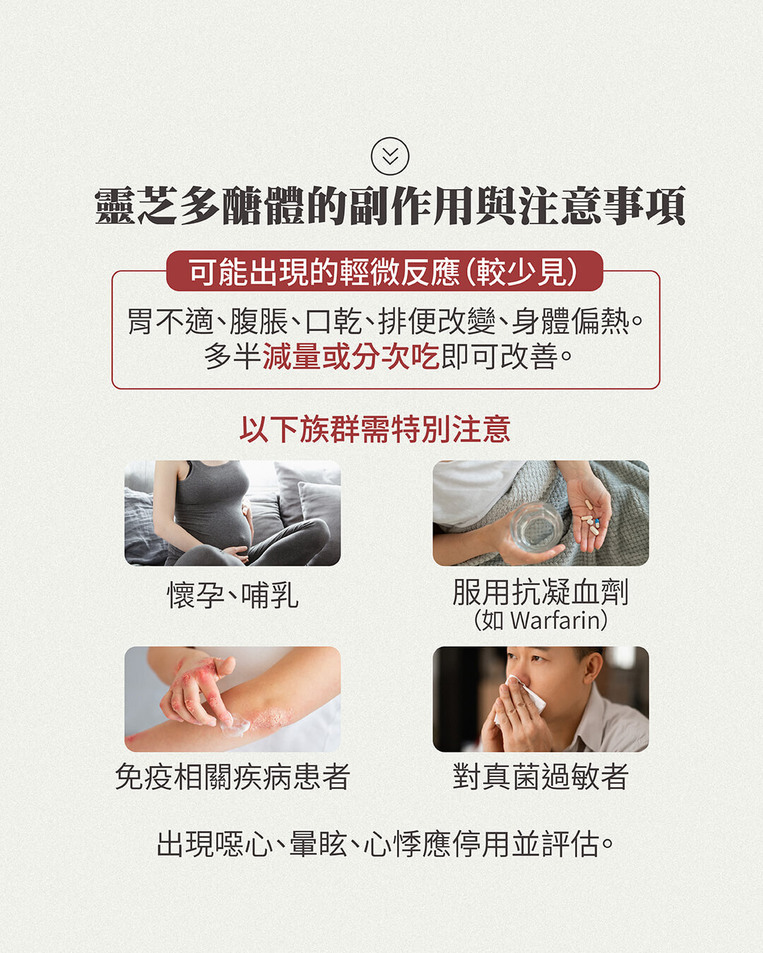 雖然靈芝多醣體安全性高,但仍要注意以下情況。