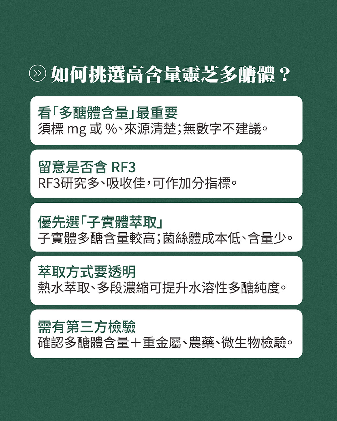 選購靈芝產品時,建議確認多醣體含量、萃取方式、來源及檢驗資料,才能挑到真正有品質的產品。