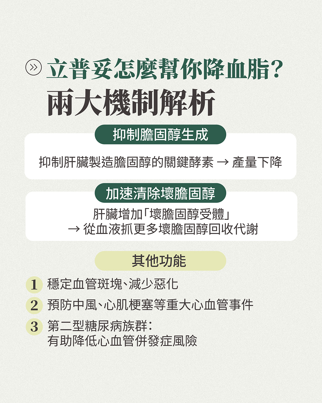 除了降血脂,立普妥還能穩定血管斑塊、預防中風及心肌梗塞,對於 II 型糖尿病患者預防心血管併發症也有顯著效果。