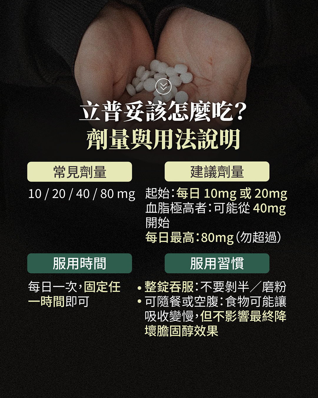 建議劑量: 起始劑量通常為每日 10mg 或 20mg,若血脂極高者可能從 40mg 開始。每日最高劑量不得超過 80mg。