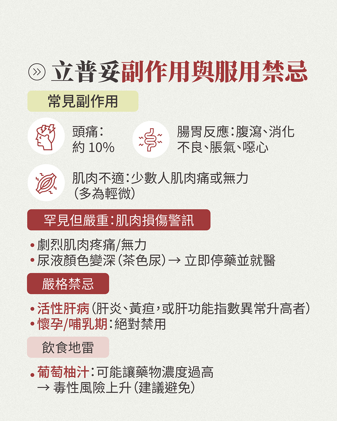 肌肉問題: 約 1% 以下的患者會出現肌肉痛或無力。極少數情況可能引發「橫紋肌溶解症」,若尿液顏色變深(茶色)或劇烈肌肉疼痛,應立即就醫。