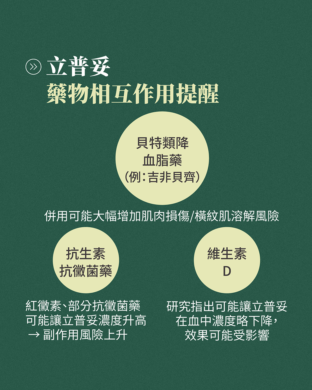在服用立普妥期間,若有並用以下藥物或營養品,請務必諮詢醫師: